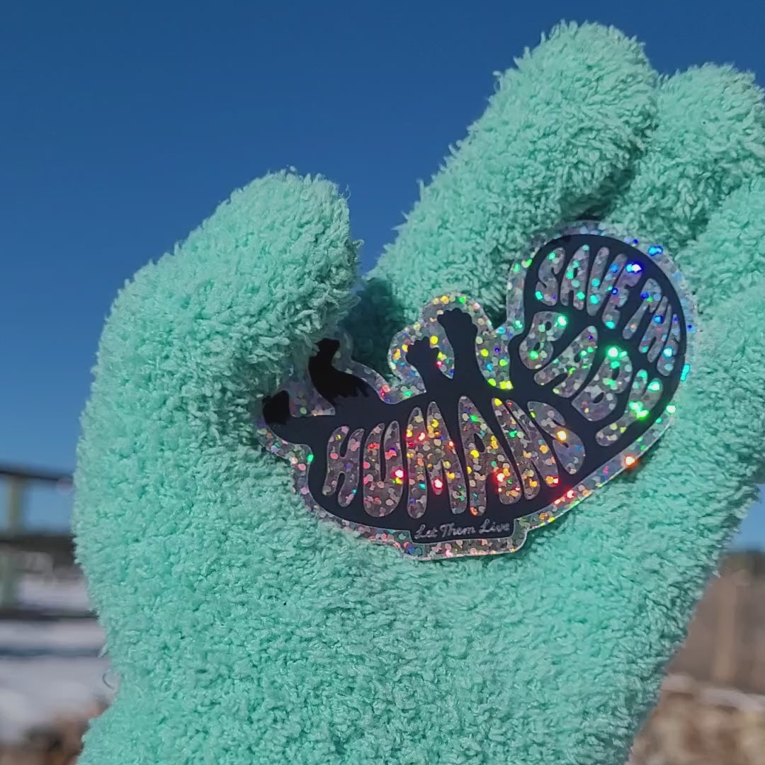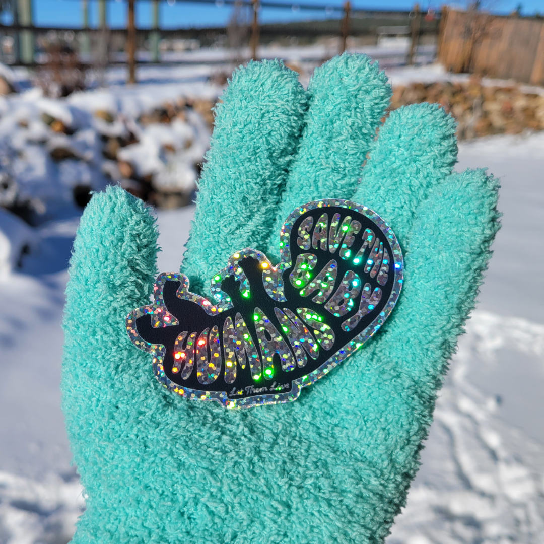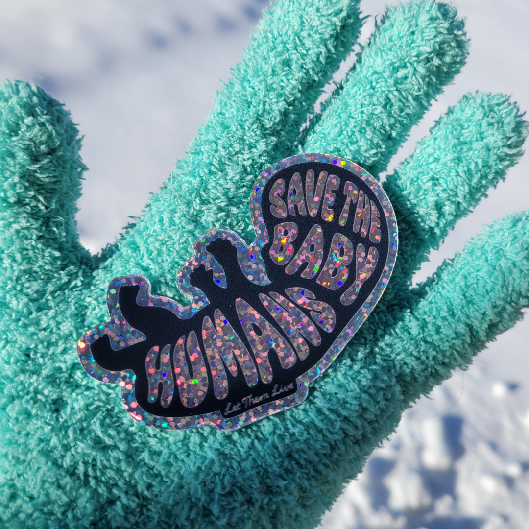 Catch everyone's eye with this glitter sticker that playfully urges to "save the baby humans." A fun and shiny way to decorate your favorite items!